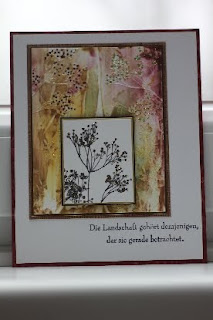 Diese Experimente wurden mit Gesso gemacht. Es hat mich mal interessiert, wie man Gesso verarbeiten kann. Hier habe ich auf das Blatt Papier Gesso gestrichen, Farbe auf Gesso gesprüht mit Color Wash und Glimmer Mist und leicht verwischt. Wer will kann noch in die feuchte Masse Glimmer einstreuen. Anschließend habe ich gestempelt und nach dem Trocknen mit Perfect Pearls "Gold" oder mit Metallic Rub-Ons "Gold" leicht darüber gewischt, um einen leichten Schimmer zu erzielen.